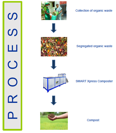 SMART Xpress Composting Machine treats the organic bio-degradable waste at the source. It operates with a very simple mechanism that breaks down the complex bio-degradable waste into its simpler forms. This deodorised waste-stock is further cured within the machine for 2-3 days to produce the compost as an end product. This ready compost acts as a soil conditioner and maintains the fertility of the soil.